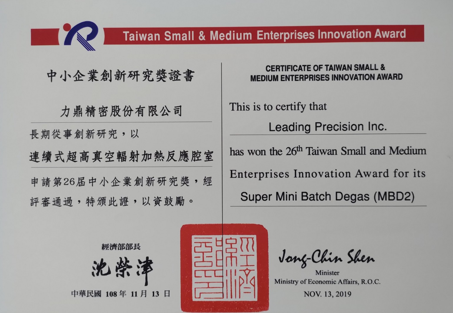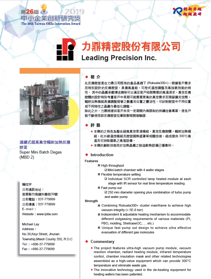 力鼎精密连续式超高真空辐射加热除溢反应腔室(MBD 2)获颁第26届台湾中小企业创新研究奖